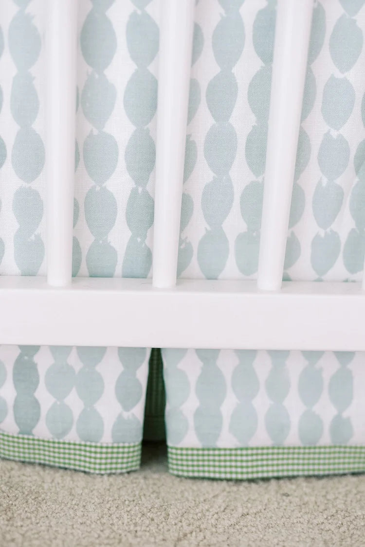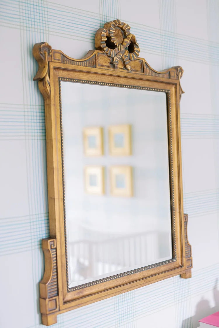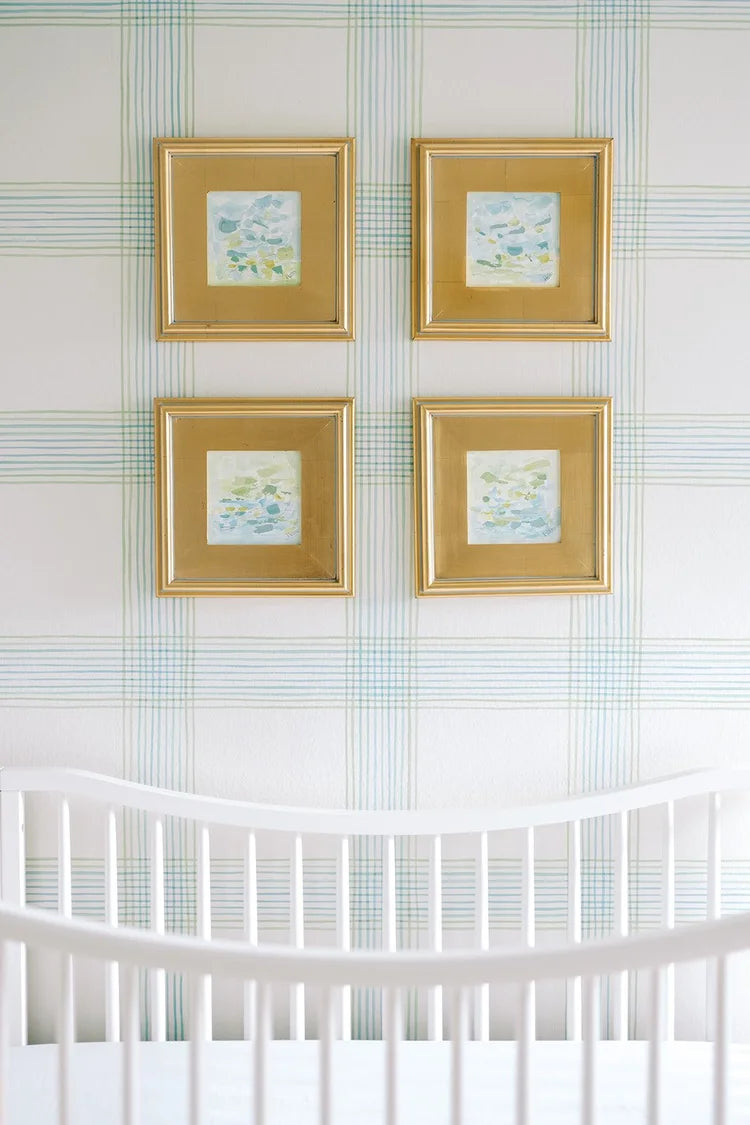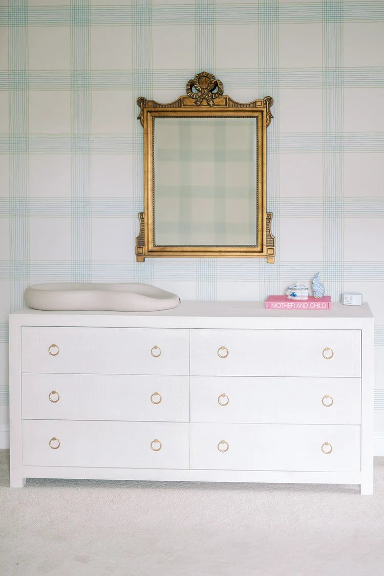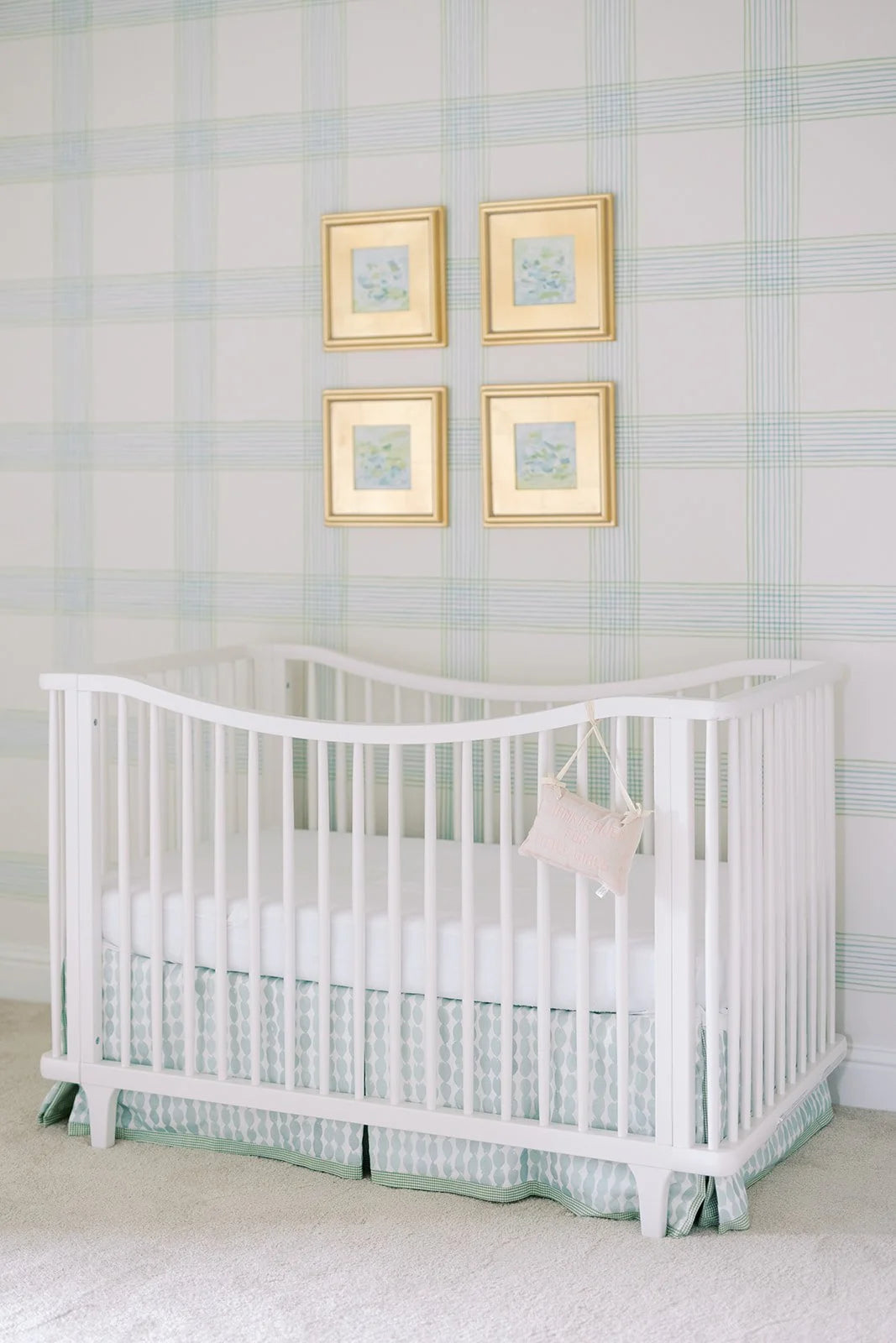 One design for two sweet peas in mind. Three schemes were narrowed down to one to befit a little boy and girl duo. The blue and green plaid wallpaper reflects a space designed to grow with them for years to come. We accented the wallpaper with the soft Alexis Walter fabric on the crib skirts paired with the richness of a gilded antique mirror over the changing table.